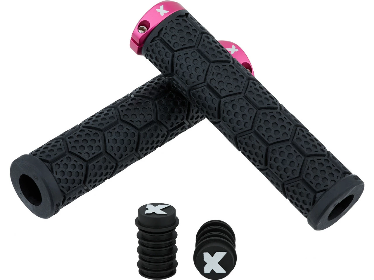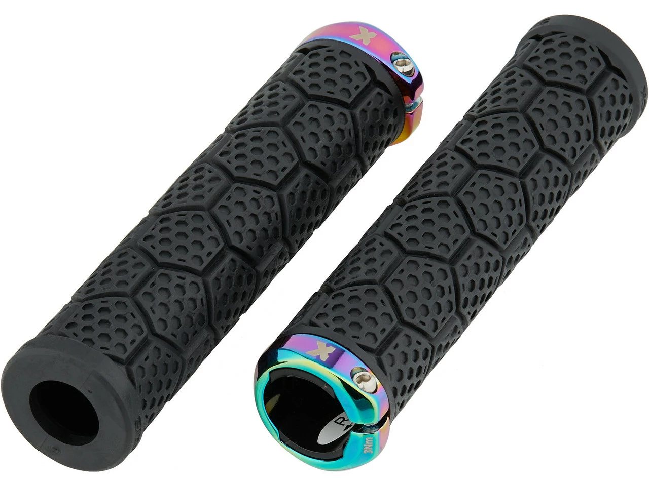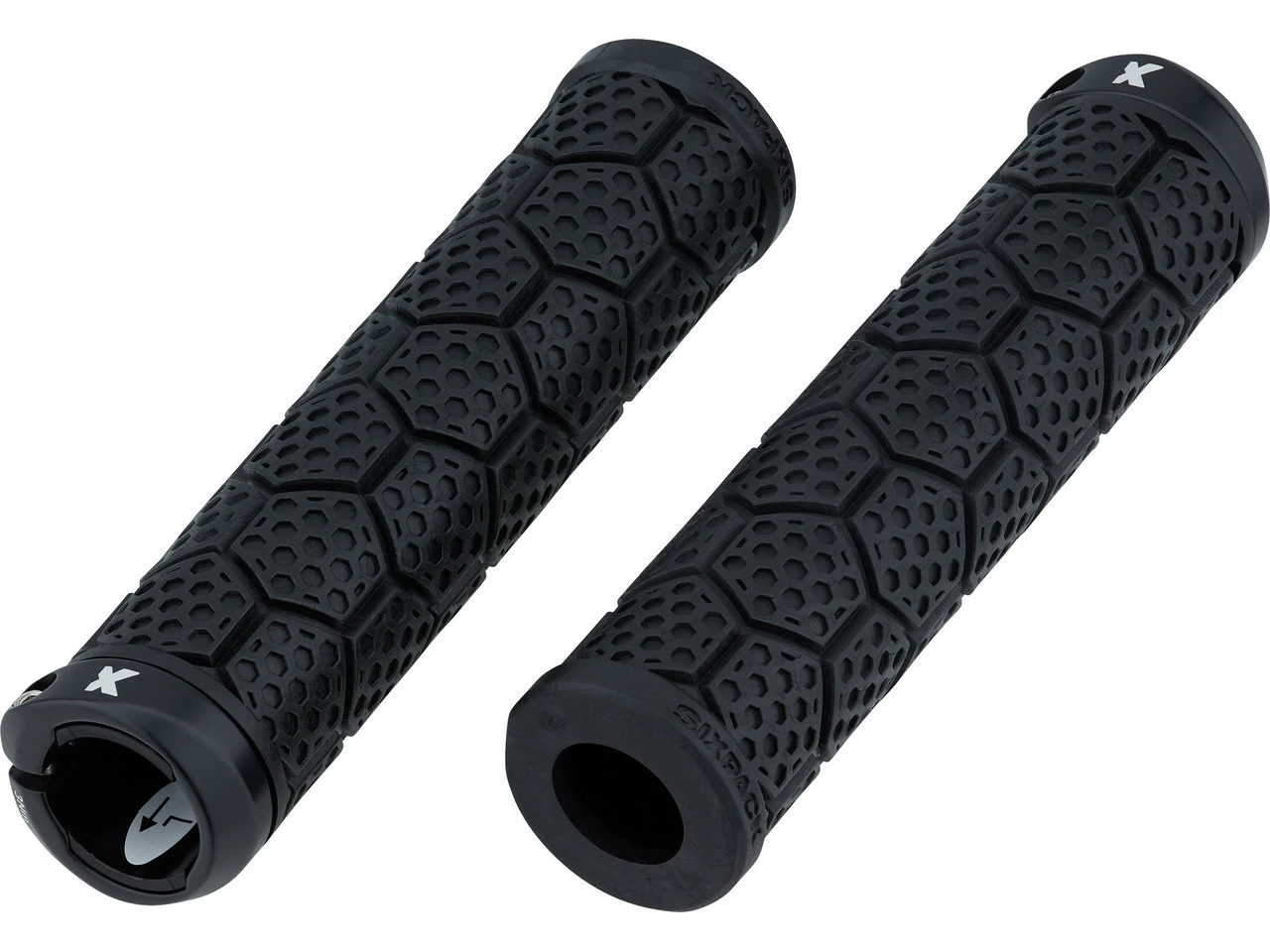Die dickeren D-Trix AL Lenkergriffe von Sixpack Racing mit Aluminium-Klemmring und Wabendesign